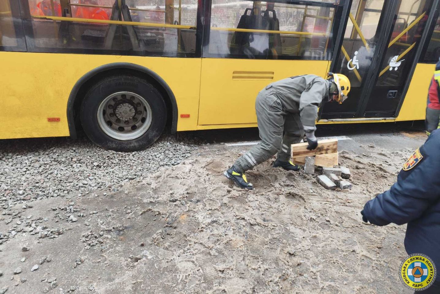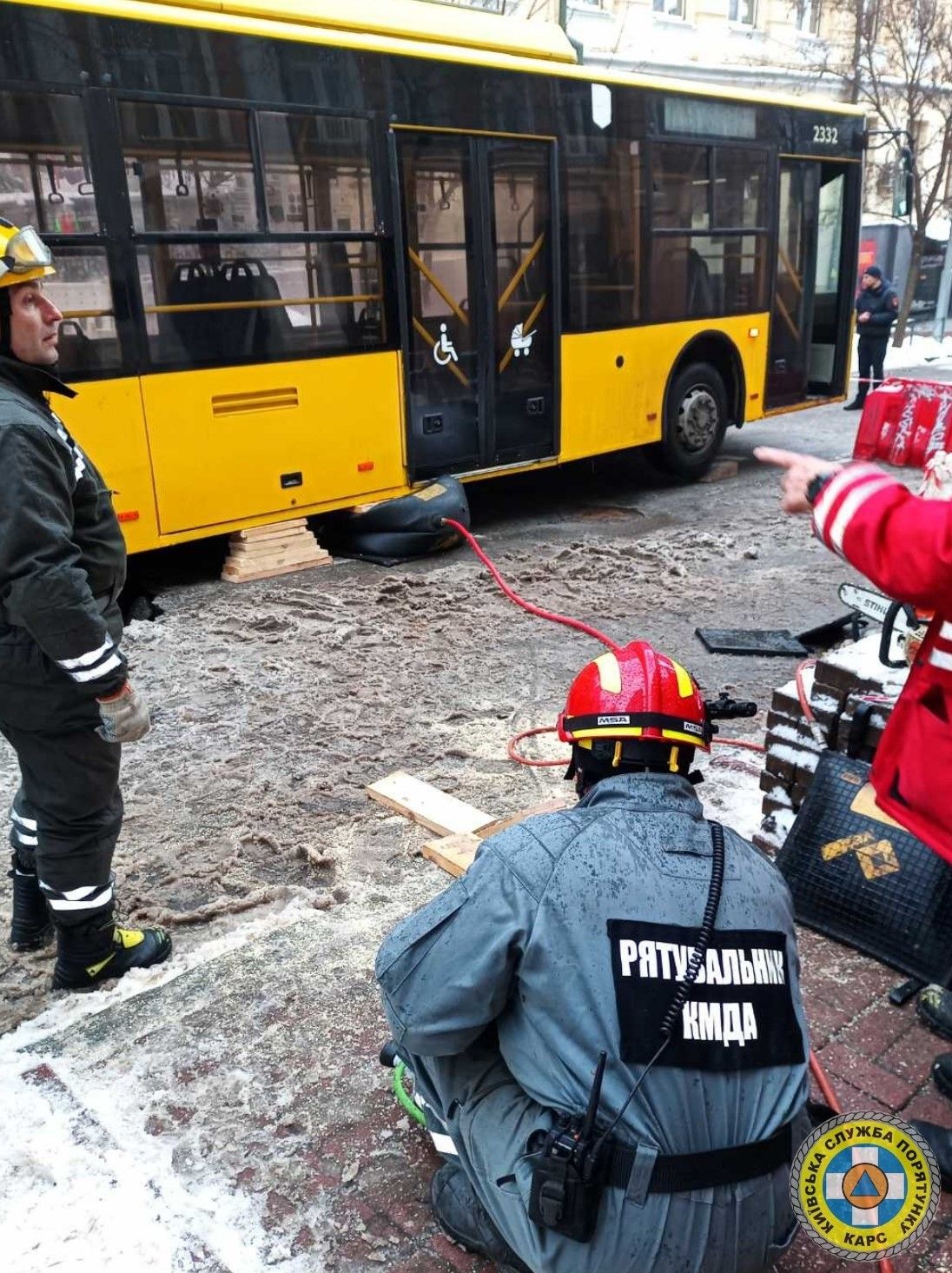 Рятувальники комунальної аварійно-рятувальної служби КАРС за допомогою спеціального обладнання підняли тролейбус, який провалився під дорожнє покриття та відбуксували його з місця надзвичайної події.