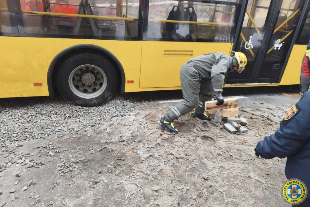 Рятувальники підняли й відбуксували тролейбус. Транспортний засіб, як повідомили у Київській службі порятунку, провалився у яму через пошкодження асфальту проїжджої частини на вулиці Софіївській у Шевченківському районі міста.