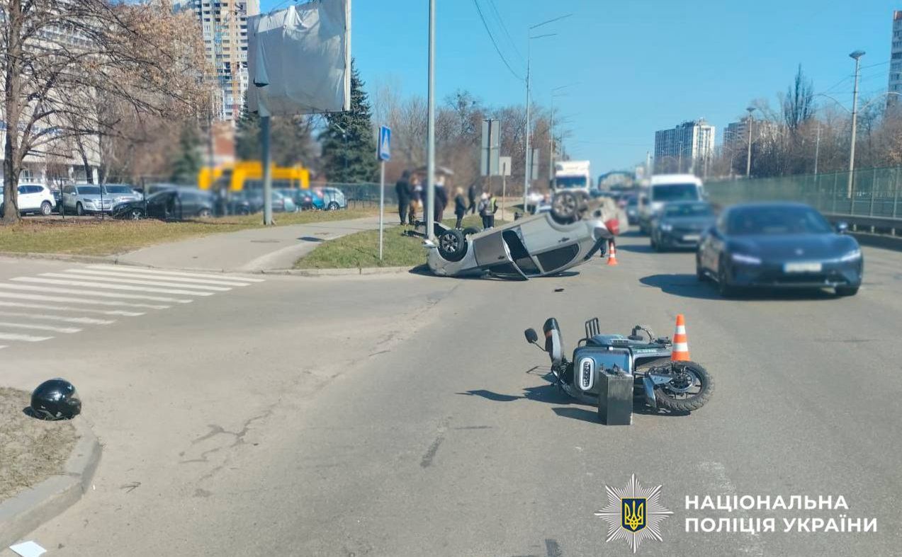 Водій легковика був напідпитку й не впорався з управління та наїхав на хлопця на електроскутері — ДПТ з перевертанням сталось на Борщагівці.