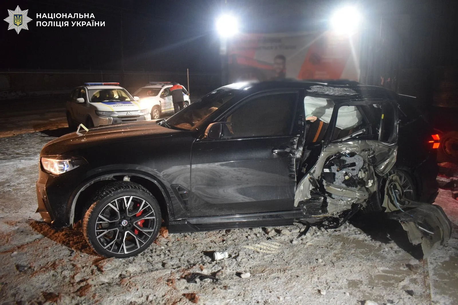 Близько першої години ночі патрульні виявили понівечений BMW X5 M. Картина була жахливою: потужна іномарка перетворилася на купу брухту після зустрічі з бетонною опорою.