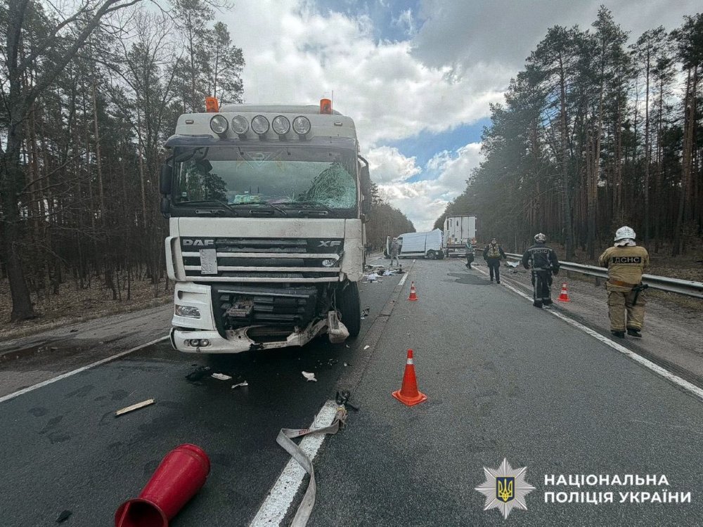 Як інформують у поліції Київської області, попередньо відомо, що на автодорозі М-07, де проводилися ремонтні роботи, водій вантажного автомобіля DAF допустив зіткнення з автомобілями Volkswagen Golf, Volkswagen Transporter, Chevrolet Epica та Renault Master, які перебували попереду.