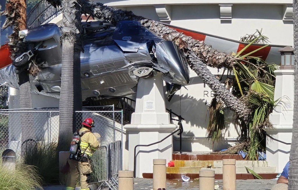 Очевидці розповідають, що перед падінням гелікоптер кілька разів перекинувся у повітрі, після чого врізався в пальми та сходи пішохідного мосту, який веде до готелю Hyatt Regency Huntington Beach Resort and Spa.