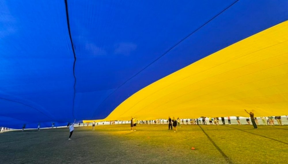 Як повідомляє United24, розмір синьо-жовтого стяга становить 60 на 40 метрів, а його вага сягає 184 кілограмів.