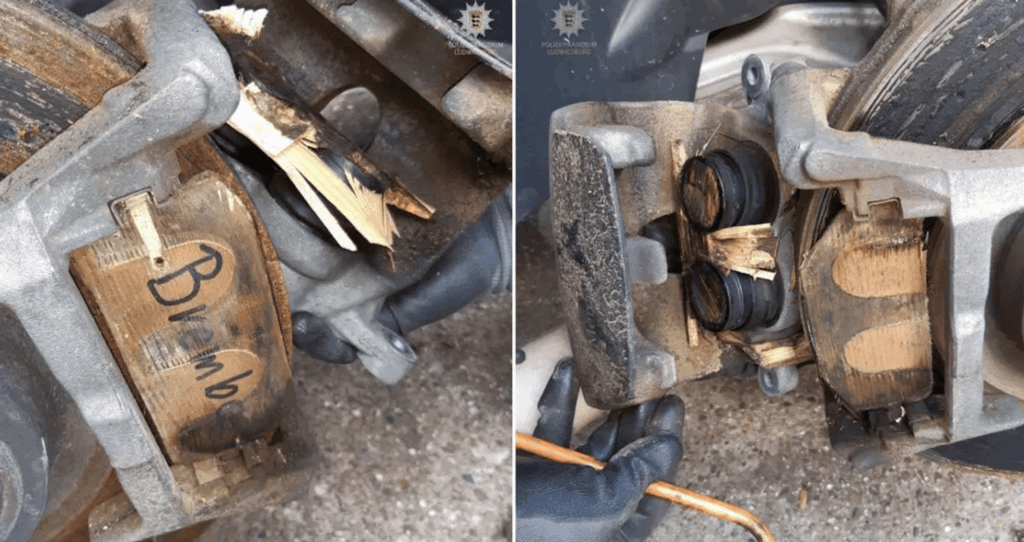 Після евакуації та перевірки в майстерні механіки остовпіли. На місці справжніх колодок – шматки фанери, вирізані вручну та підписані чорним маркером «Brembo».