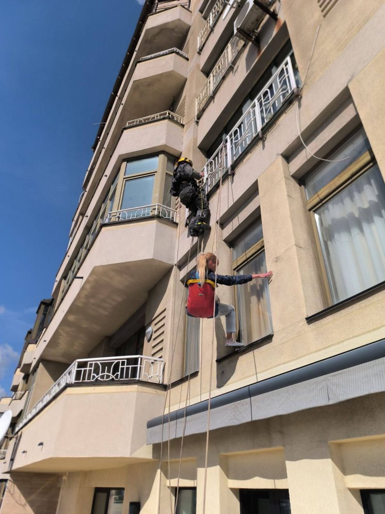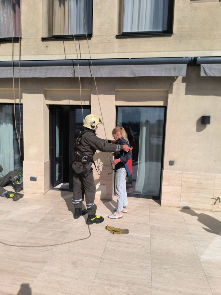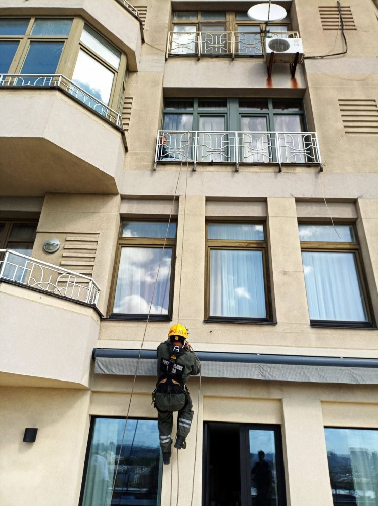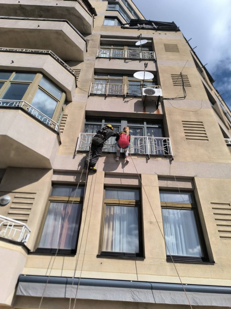 Застосувавши альпіністське спорядження, вони дісталися до 11 поверху й використавши страхування, спеціальні кріплення та рятувальний «кошик», спустили жінку на землю.