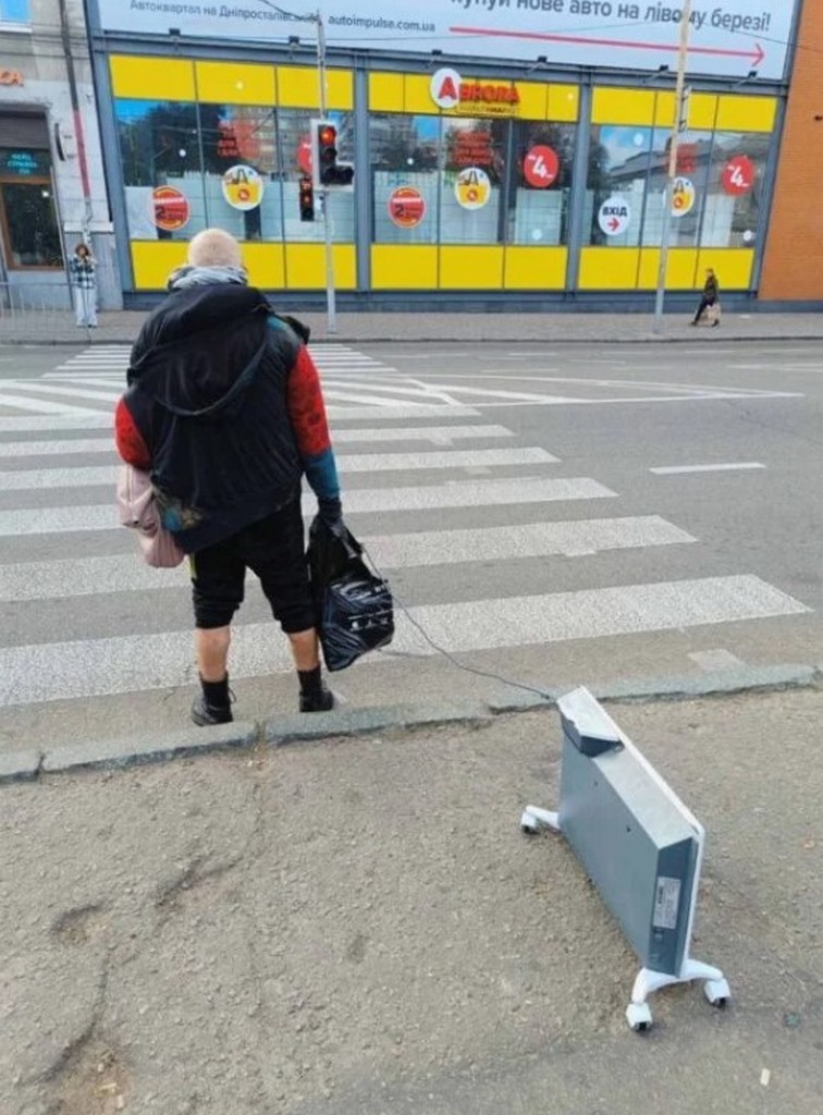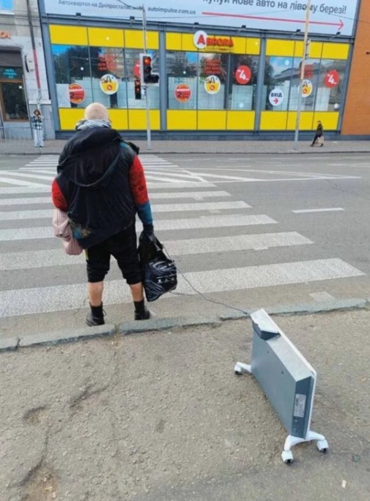 Як розповіли свідки, незвичну сцену помітили на лівому березі міста. Чоловік стояв перед пішохідним переходом, тримаючи в руці шнур від обігрівача, що знаходився поряд на тротуарі. Збоку це виглядало так, ніби городянин вигулює свого вихованця.