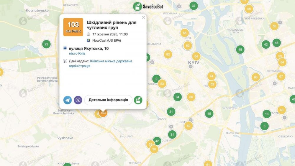Найгірша ситуація зафіксована у Святошинському районі, де індекс якості повітря сягнув 103 пунктів — це рівень, що класифікується як «нездоровий».
