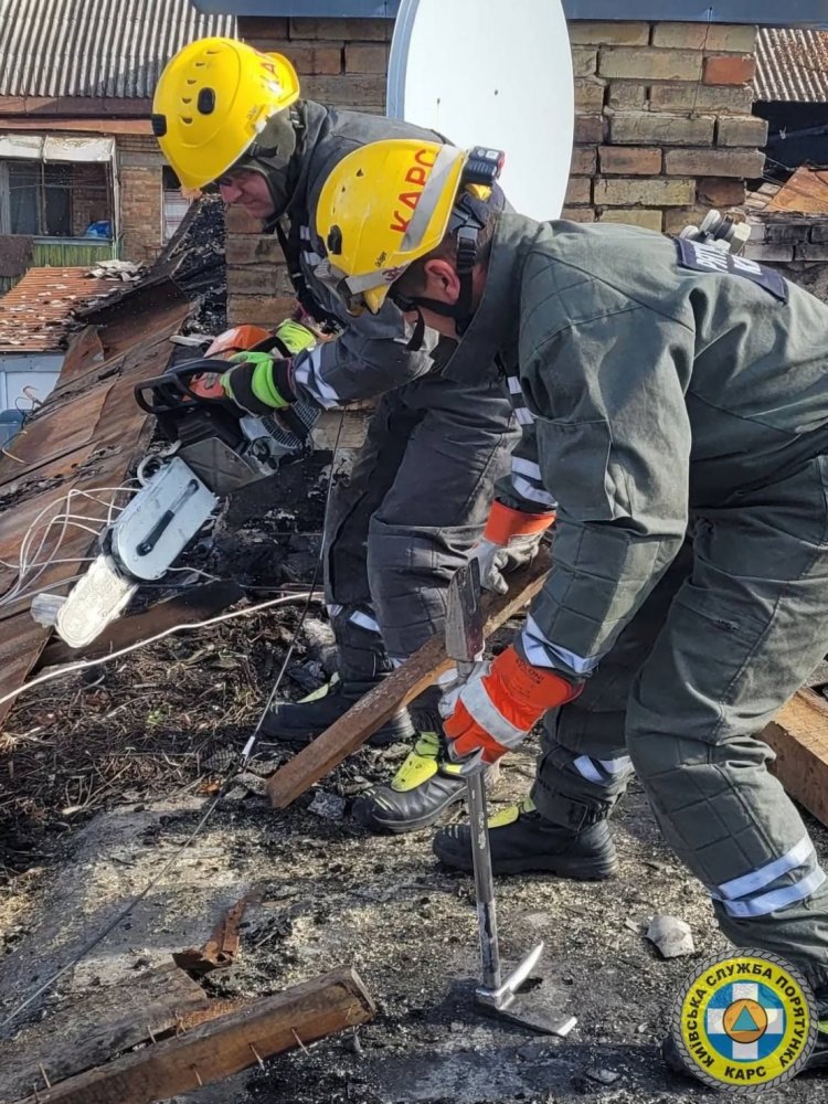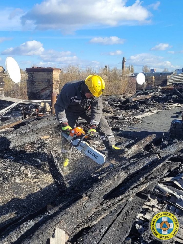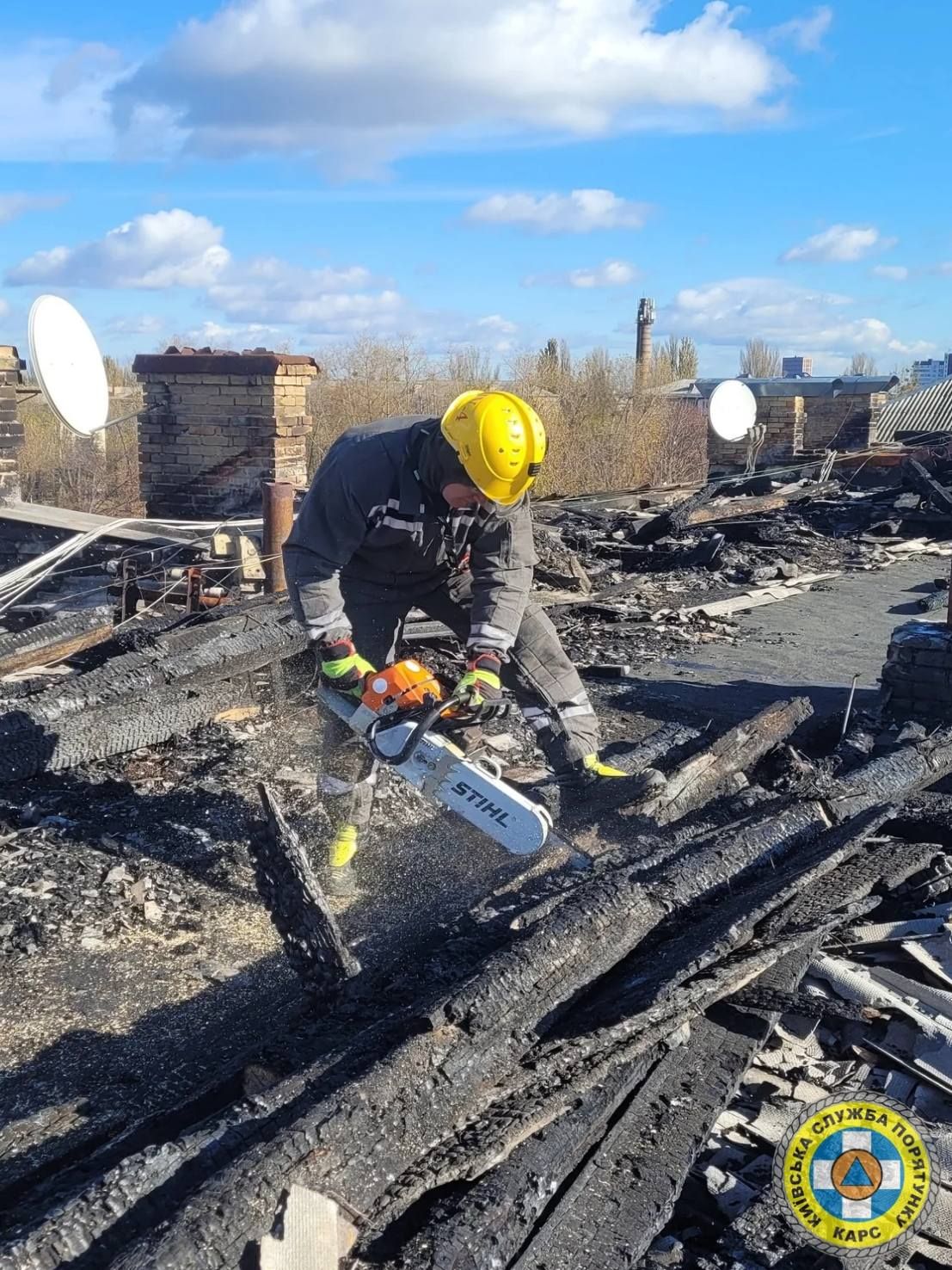 Під час ліквідації наслідків рятувальники КАРС за допомогою спецтехніки виконали демонтаж пошкоджених конструкцій даху — зокрема зрізали обгорілі крокви та мурлати, щоб працівники керуючої компанії могли безпечно вилучити залишки зруйнованих елементів.