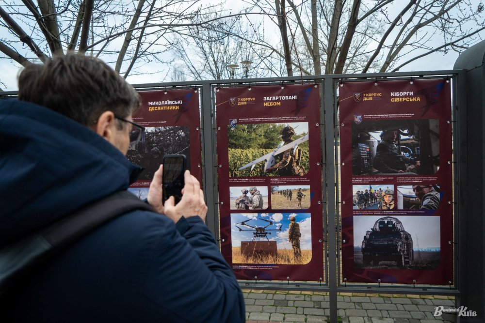Фотовиставку відкрили просто неба на Оболонській набережній на початку парку «Наталка». Її підготували бійці 7 корпусу швидкого реагування Десантно-штурмових військ ЗСУ.