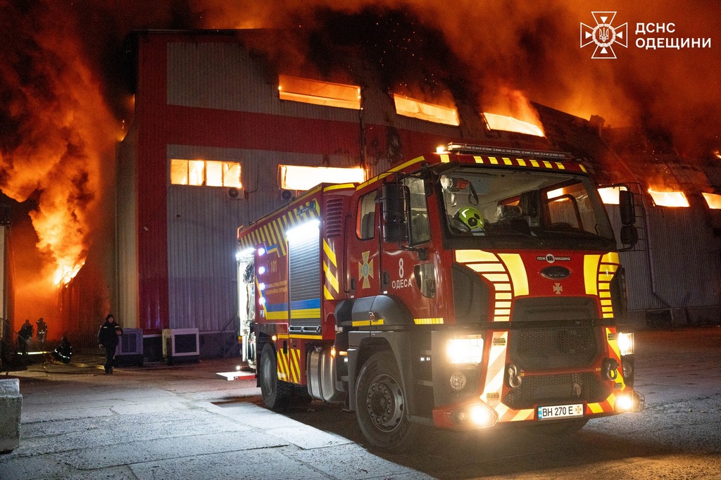 Російська армія вчергове завдала удару по цивільній інфраструктурі Одеської області, застосувавши десятки ударних безпілотників. Одним із наслідків атаки стала масштабна пожежа на території підприємства.