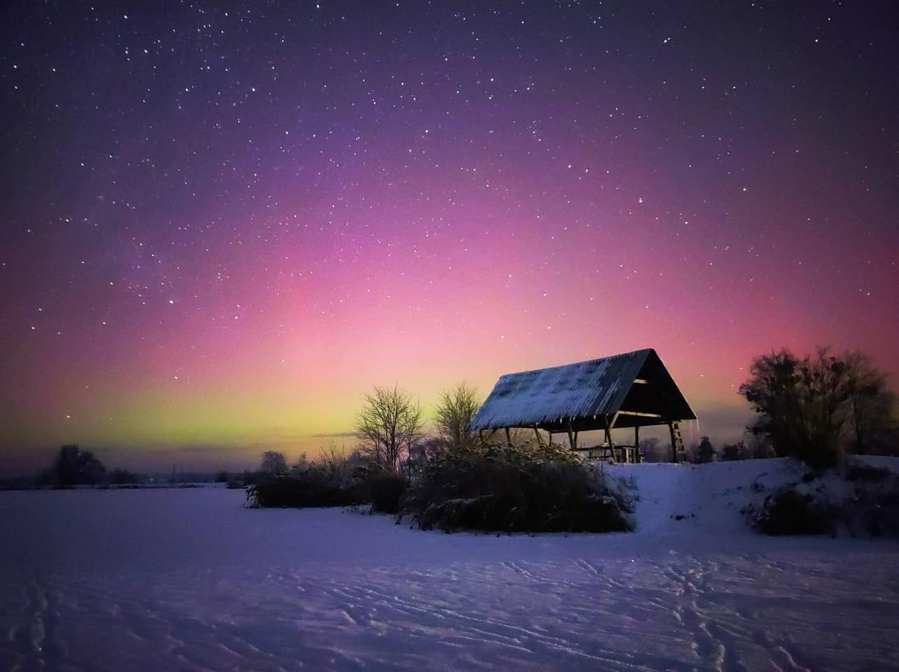 У ніч на 23 січня мешканці села Здвижівка стали очевидцями незвичного для України природного явища — північного сяйва. У небі з’явилися яскраві рожеві та зеленуваті відтінки, які освітлювали зимовий краєвид і були добре помітні навіть без спеціальної оптики.