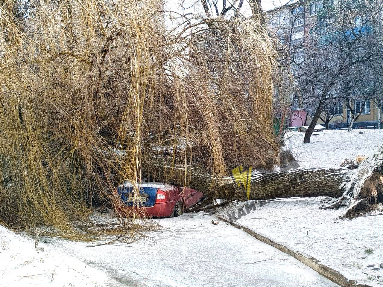 На Сергія Слісаренка (колишня Скаліка) у Камʼянському 19 лютого дерево вкрите кригою впало на припарковані легкові автомобілі у дворі між багатоквартирними будинками, передає "Відомо" з посиланням на Телеграм-канал "Труха Камʼянське".