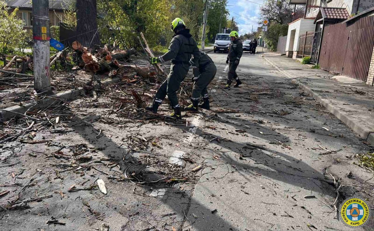 «Через сильні пориви вітру бійці КАРС „Київська служба порятунку“ з учорашнього вечора працюють над усуненням аварійних ситуацій.