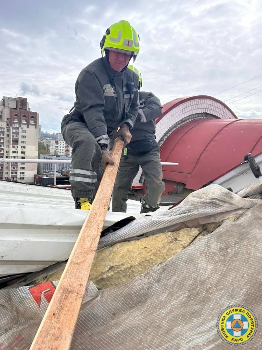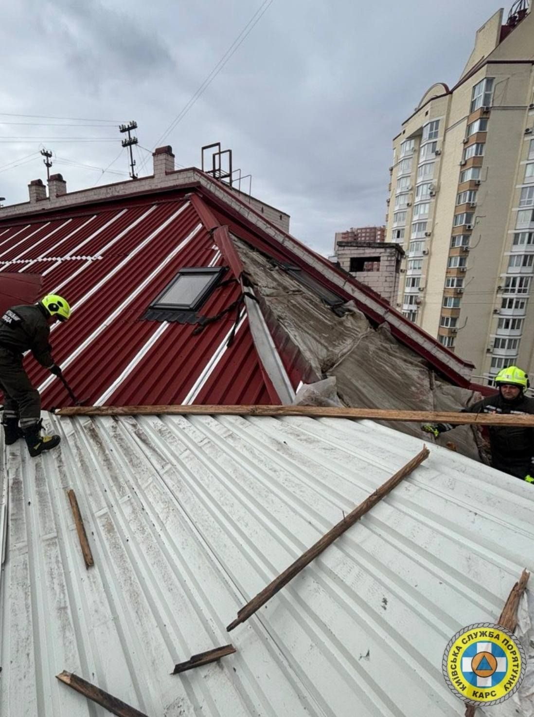 Оболонський район: На даху житлового будинку вітер відірвав лист заліза. Конструкція нависала прямо над пішохідною зоною. Рятувальники демонтували близько 12 $м^2$ аварійної покрівлі, усунувши загрозу для перехожих.