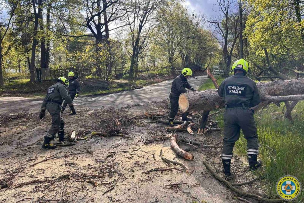 Оперативні підрозділи 1-го та 4-го взводів розчищають дороги від повалених дерев та демонтують небезпечні конструкції», — зазначили у своєму дописі на сторінці Департаменту муніципальної безпеки КМДА.