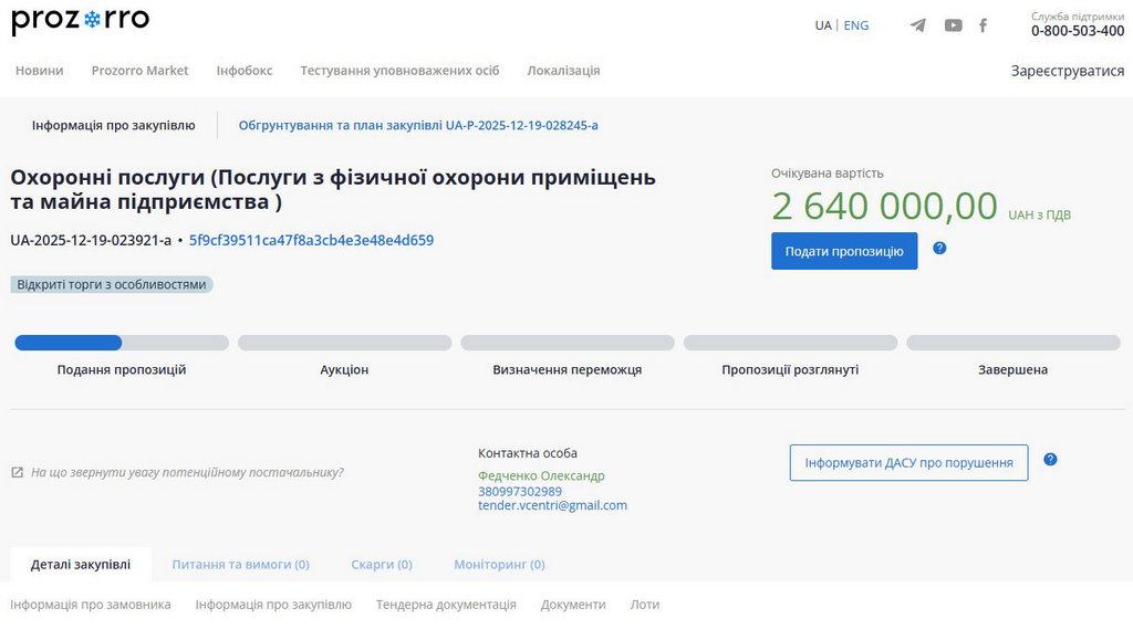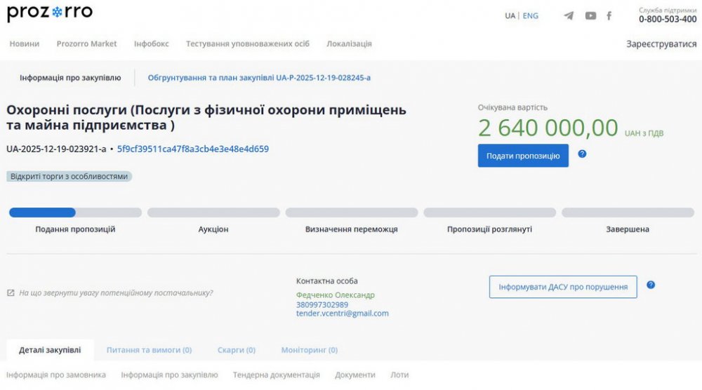 Відповідні дані оприлюднено на сайті електронних закупівель Prozorro.