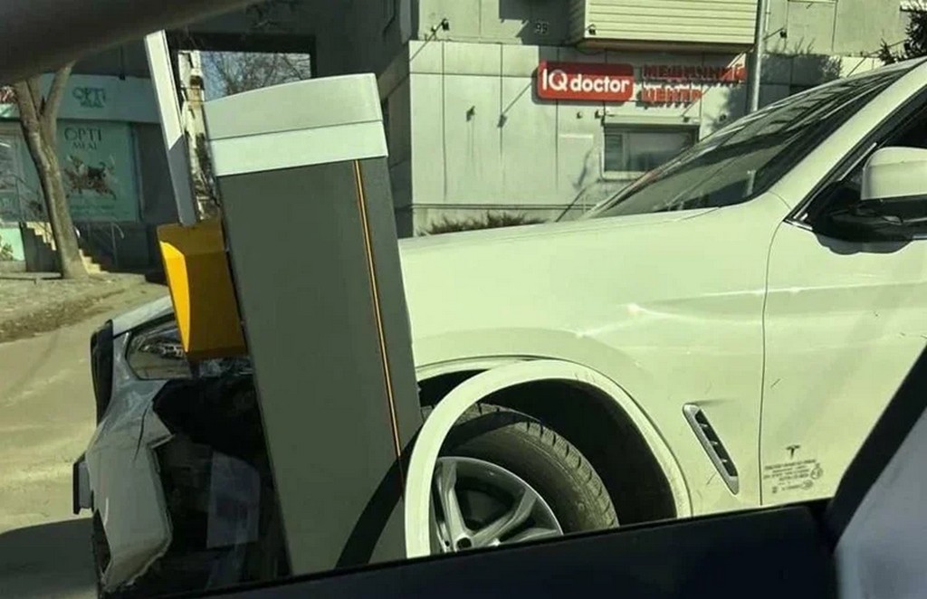 На проспекті Науки біля ТРЦ Neo Plaza BMW з номерами «ХАЛЕПА» в’їхав прямо в тумбу шлагбаума на парковці, пошкодивши і саме обладнання, і свій автомобіль.